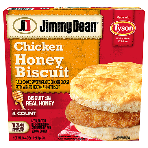 Enjoy a classic and easy breakfast that starts the day off right with our Jimmy Dean Chicken Honey Biscuits. Taste the crisp white meat chicken in the patties sandwiched by flaky and soft honey biscuits. Each chicken and biscuit breakfast sandwich has 13 grams of protein and is made with premium white meat chicken and real honey. Easily prepare in the microwave or the air fryer for an extra crisp texture, and follow the cooking directions on the box. Each box contains four sandwiches. Keep frozen until ready to prepare. Ready when you are, our Jimmy Dean Chicken Honey Biscuits help your day in a sweet and savory way.