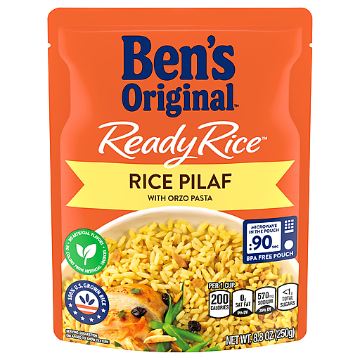 BEN'S ORIGINAL Ready Rice Rice Pilaf is a deliciously seasoned microwave rice that helps you prepare a savory cooked rice side dish in just 90 seconds. Blending long grain rice with orzo pasta, herbs and seasonings, this parboiled rice comes fully precooked for a quick bite you can heat in no time or a delicious meal side you and your family will love. Available in a BPA-free microwaveable rice pouch, Ready Rice eliminates prep and cleanup so you can spend less time in the kitchen and more time enjoying a delicious meal. Simply microwave the rice pouch for 90 seconds, or pour the rice into a skillet and heat it thoroughly until ready to serve. This parboiled rice tastes great with any combination of vegetables and your favorite chicken, fish, or beef recipes. Ready Rice flavored rice contains no artificial flavors, no colors from artificial sources, and no trans fat. Ben’s Original is dedicated to creating meals and experiences that offer everyone a seat at the table.