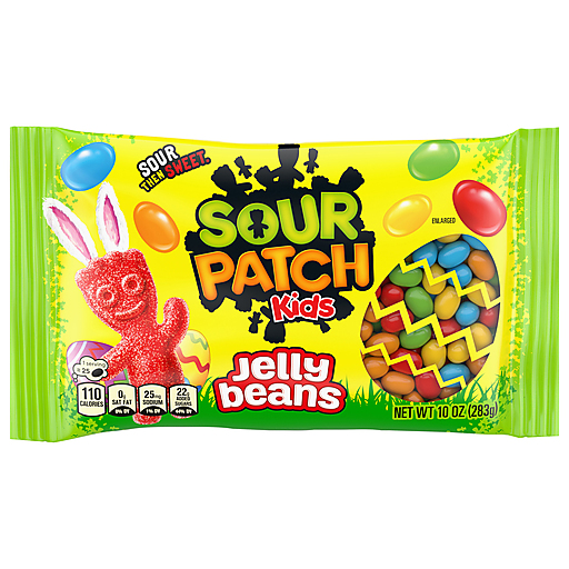 SOUR PATCH KIDS Jelly Beans add a delicious SOUR THEN SWEET touch to your Easter candy gifts with a twist on the classic candy. This bagged candy features sour jelly beans with the original SOUR PATCH KIDS candy flavor you love for a SOUR THEN SWEET treat. Classic Jelly Bean shapes in bright colors make this a fun sour Easter candy option. Pour these sour jelly beans into a bowl as a colorful centerpiece at your celebrations, or use a bag of candy as a basket filler. This chewy candy is also ideal for decorating festive desserts like cupcakes and cookies. This candy comes sealed in a bag to keep it fresh until you're ready to enjoy it.